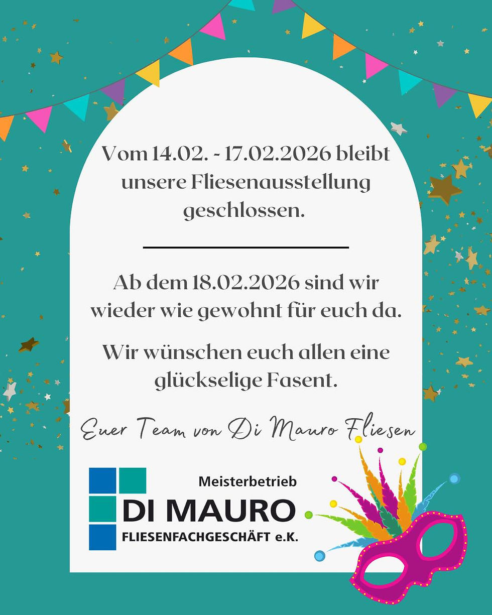 Über die närrischen Tage bleibt unsere Fliesenausstellung vom 14.02. - 17.02.2026 geschlossen.