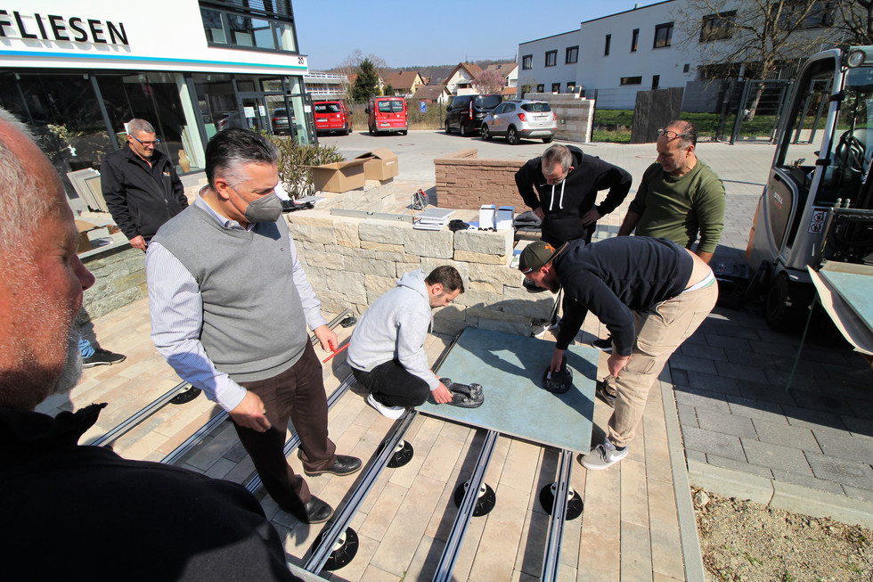 Vorgestellt wurden auch Neuheiten wie lose Verlegung auf Stelzlagern mit Schienensystem.